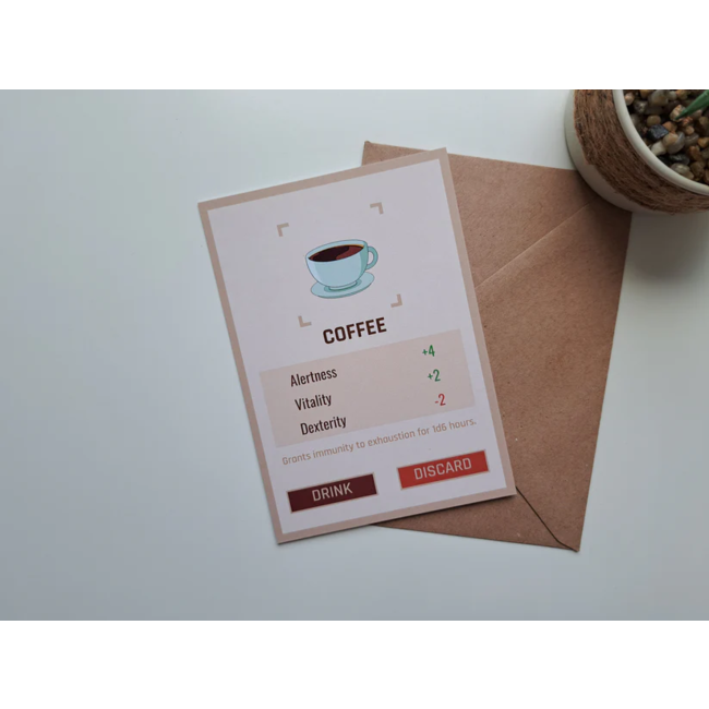 The "Coffee game token" greeting card is perfect for the gamer and coffee enthusiast in your life. It features a stylized coffee cup with RPG-style stat boosts, humorously granting the drinker increased alertness and vitality while sacrificing a bit of dexterity. This card is a fun way to offer encouragement, celebrate a milestone, or simply let someone know you're thinking of them during a busy workweek.